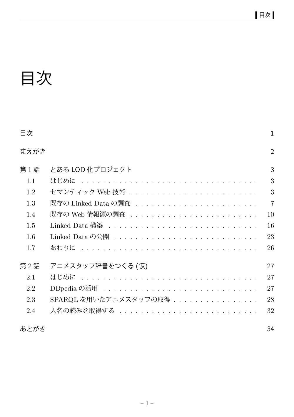 prev next とあるシリーズのデータセットやアニメスタッフ辞書の作成など、データセット作成の事例を紹介。Webページから抽出したデータからRDFデータを作成、SPARQLを使った問い合わせなど、実践的な内容を多めに盛り込んでいる。 参考リンク とあるSPARQL 発行日 2018-08-11 初頒布イベント コミックマーケット94(C94) 著者 ばびぶべぼん、てんくろ ISDN ISDN278-4-663011-05-1